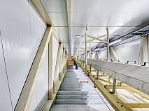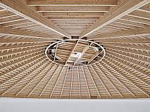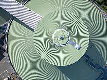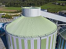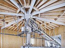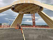Mit einer Dach-Holzkonstruktion, die ihresgleichen sucht. Sei es bei der Planung, aber auch bei der Montage, welche in 60 Metern Höhe erfolgte und keine Ungenauigkeiten zuliess. Das aussergewöhnliche knapp 20 Tonnen schwere Dachtragwerk mit einem Durchmesser von 40 Metern wurde aus insgesamt 171 m3 Brettschichtholz erstellt. Die einzelnen Dachelemente wur den im Werk in Rohrbach vorgefertigt und ins knapp 57 Kilometer entfernte Aarberg transportiert.