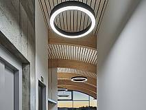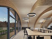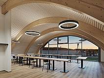 Dachelementen sowie den Innenausbau im Dachbereich. Das Ergebnis ist ein funktionaler Bau mit klarer Konstruktion und hoher Ausführungsqualität – ein wirtschaftlicher Rundholzbau, der zeigt, was mit moderner Holzbauweise möglich ist.