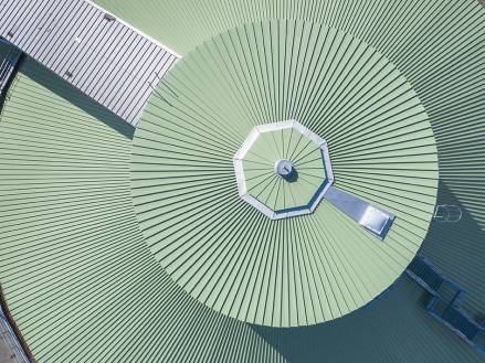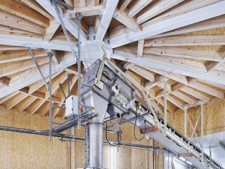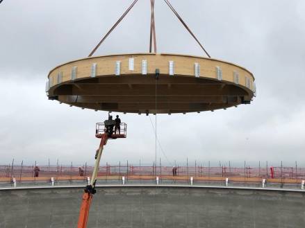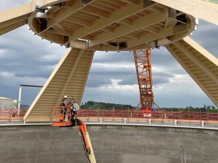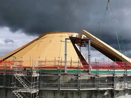 Mit einer Dach-Holzkonstruktion, die ihresgleichen sucht. Sei es bei der Planung, aber auch bei der Montage, welche in 60 Metern Höhe erfolgte. Ein schwieriges Unterfangen, abhängig von Wind und Wetter.